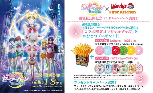 ファーストキッチン株式会社(代表取締役:紫関修 所在地:東京都新宿区)では1月8日(金)より、ファーストキッチンならびにウェンディーズ・ファーストキッチンにて、劇場版「美少女戦士セーラームーンEternal」公開記念!コラボキャンペーンを開催いたします。