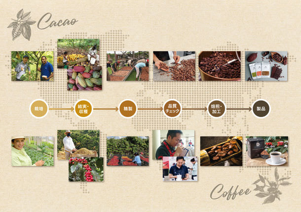 カカオとコーヒーの栽培から製品化までの流れ。双方、熱帯性の果実の種子を取り出し加工する。