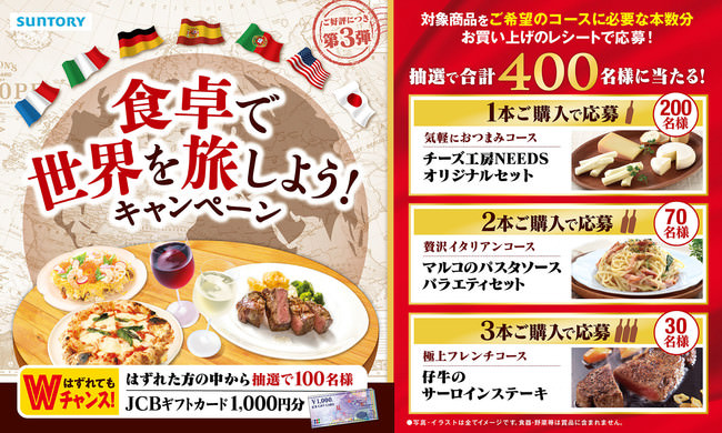 対象商品のご購入本数に応じて、抽選で合計300名様に仔牛のサーロインステーキなど豪華グルメが当たります。また、Wチャンスとして、外れた方の中から抽選で100名様にJCBギフトカードが当たります。