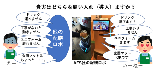 他の配膳ロボットが「稼働前に工事が必要」「ドリンクは運べない」「玄関マットはちょっと・・・。」「できれば従業員も一緒に来てほしい」などと仕事を選ぶ(条件をつける)中、AFS社の配膳ロボットは「工事不要」「ビールを中心としたドリンクも運びます」「玄関マットも大丈夫」という勤務姿勢。更に、配膳・下げ膳の途中で流れる動画でのインフォメーションや装飾(今回は、実証実験先のTシャツを着ております)も行えるという。そして、その様子は名古屋ロボットショーケースでは見れないが練習の様子を、事務局がホームページ上で公開したことから、その動画を見た方々から「これが配膳ロボット」との称賛の声が上がっているという。