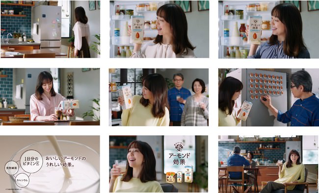 普段から、お家では1Lパックのアーモンド効果、お仕事先では200mlパックのアーモンド効果・・と、アーモンド効果を愛飲されているブランドアンバサダーの松島さん。そんな松島さんの日常の風景をほんとうに再現したかのような今回のCM。「今日は・・」と言いつつ、冷蔵庫から結局アーモンド効果を選んでしまう松島さんのチャーミングな笑顔が印象的なCMに仕上がりました。