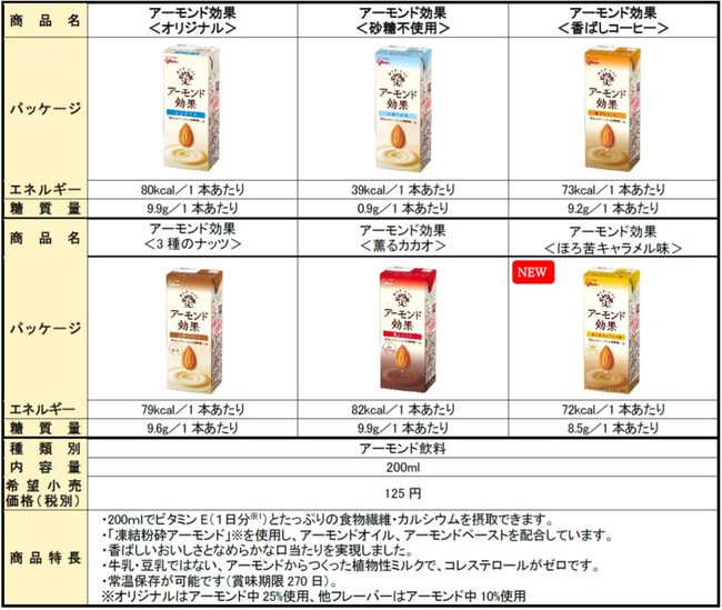 1日分のビタミンE※1とたっぷりの食物繊維・カルシウムが摂れる飲料として、ご愛顧いただいている「アーモンド効果」は、幅広いお客様にあらゆるシーンでお楽しみいただけるようさまざまなフレーバーを展開してまいりました。今回は、そのラインアップに<ほろ苦キャラメル味>を新たに追加。スッキリとした甘みと後味のキャラメル味に仕上げることで、ちょっとした小腹を満たす「おやつシーン」で楽しんでいただけます。
