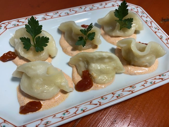蒸し餃子を濃厚な海老の風味のトマトクリームで提供いたします。 もちろん餃子の中にも海老が入っていて餃子の常識を覆します。白ワインや海外のヴァイツェンなど酵母の香りとよく合います。