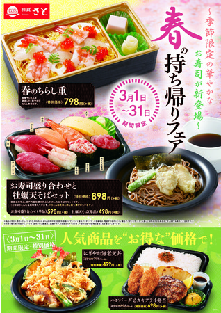 国内205店舗を展開する和食ファミリーレストラン「和食さと」では、春のお持ち帰りフェアとして新商品「春のちらし重」や「お寿司盛り合わせと牡蠣天そばセット」を、3月1日(月)から3月31日(水)まで期間限定で販売します。