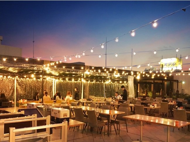 駅直結「アスナル金山」の屋上で毎年恒例のビアガーデン開催。広々とした空間で夜景を眺めながら本格コリアンBBQが味わえる。
