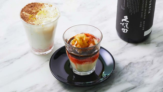 今や世界中で愛される日本酒をもっとデイリーに楽しめるように、淡麗辛口の銘酒「久保田」を手掛ける新潟県の老舗酒蔵「朝日酒造」と、特別に作られたカフェ丸の内店限定ドリンク。凛とした甘さの「久保田 純米大吟醸」を使い、日本酒ビギナーにもおすすめのいちごを使った、春のドリンクとデザートを作りました。カフェ丸の内店の贅沢な空間でお楽しみください。