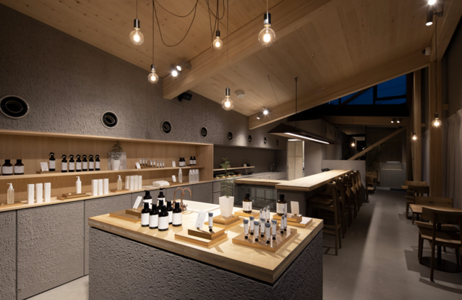 店舗は岐阜県産桧CLT工法と在来工法を組み合わせたハイブリッド工法で組み上げました。設計は成瀬猪熊建築設計事務所が、構造設計は一昨年マルヤマグループに入った岐阜県美濃加茂市の株式会社木構堂がそれぞれ担当しました。