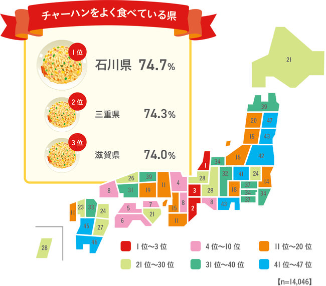 - 「チャーハン」喫食率ランキング1位は「石川県」 !〔*3〕 喫食率ランキングでは「石川県」「三重県」「滋賀県」「京都府」の順。1か月に食べる量は「山形県」が1位。*3 全国で算出した方法と同様に、都道府県別でも喫食率および喫食量を推計。