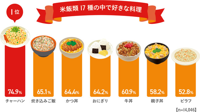 米飯料理17種類(複数選択可)の中では「チャーハン」好きが74.9%と際立って多く、次いで「炊き込みご飯(65.1%)」「かつ丼(64.4%)」「おにぎり(64.2%)」「牛丼(60.9%)」と続いた。