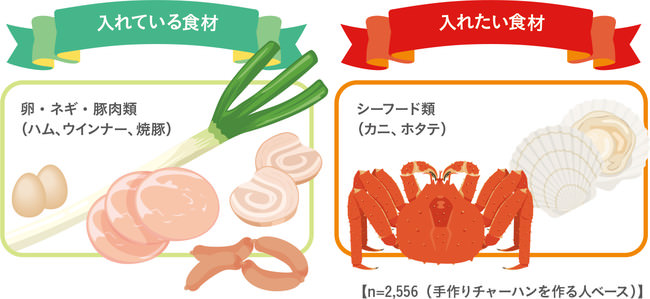 具材は卵・ネギ・豚肉類(ハム、ウインナー、焼豚)が中心だが、「カニやホタテといったシーフードも具材として入れたい(でも、実際にはなかなか入れられない)」といった意向も目立つ。