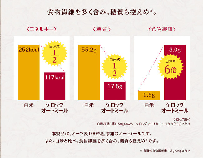 「ケロッグ オートミール」は、白米ご飯と比べて糖質が約1/3と控えめ※3。さらにオーツ麦由来の発酵性食物繊維※2も含まれており、腸活をはじめ、健康的な食生活を意識したい方の新しい毎日の主食にぴったりの製品です。