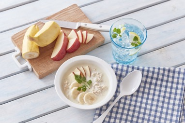➁食べる際にりんごやバナナをトッピングする。