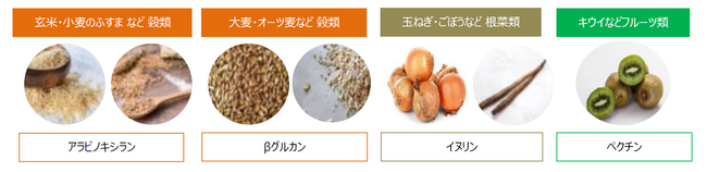 発酵性食物繊維とは、腸内細菌によって発酵分解されやすい食物繊維を指します。発酵性食物繊維は、穀物や根菜などの食品に多く含まれます。小麦や玄米の「ぬか(ブラン)」部分に含まれる「アラビノキシラン」、大麦やオーツ麦に含まれる「βグルカン」、ごぼうや玉ねぎなどに含まれる「イヌリン」、フルーツ類に含まれる「ペクチン」などが代表的な発酵性食物繊維です。