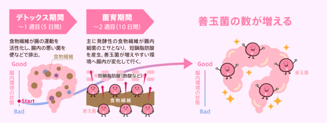 安達祐実さんをはじめとして、キレイを保ち続けている人たちの腸能力のポイントは、腸内細菌が体内で生み出す酪酸などの短鎖脂肪酸にあるのではないかと考えています。今回、食事で推奨される小麦ブランシリアルに豊富に含まれる発酵性食物繊維「アラビノキシラン」は、腸内細菌のエサとなり、その働きを活性化させます。継続的な摂取で酪酸などの短鎖脂肪酸を増加させることにより、腸内環境が整い、キレイにつながると考えられています。人の腸内細菌は多種多様のため腸活の効果にはばらつきがありますが、一般的な腸活では、開始直後から1週間程度は、食物繊維が腸を動かし、腸内にある悪玉菌を体外に排出する期間(デトックスフェーズ)と、その後、約1週間から1ヶ月程度の期間をかけて、腸内に棲む善玉菌が食物繊維をエサとして増加する期間(菌育フェーズ)へと移行します。特に、菌育フェーズでは、小麦ブランシリアルに加えて他の発酵性食物繊維や発酵食品を複数取り入れたシンバイオティクスメニューを食べることで、腸能力が高まると考えられます。今回のプログラムは、これらのポイントを加味して、フードプランナー/管理栄養士 岸村康代先生が監修された、日常生活で手軽に実践できるレシピと、株式会社ティップネス提供による腸エクササイズの2つで構成しました。