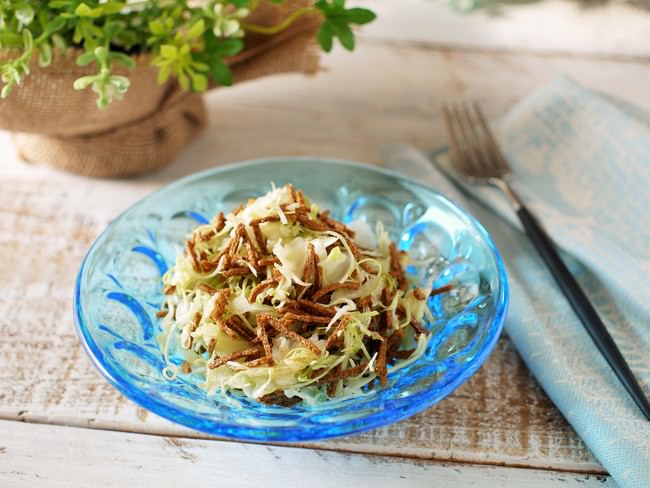 ① 器に千切りキャベツ、オールブラン、鶏ガラスープの素、ごま油を入れ、混ぜ合わせる。