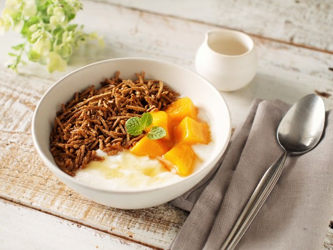 ① ヨーグルトにオールブランとマンゴーをのせ、お好みではちみつをかける。