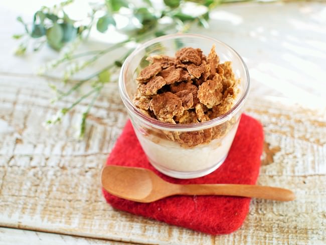 ① 甘酒にオールブランをのせ、ココアパウダーをかける。