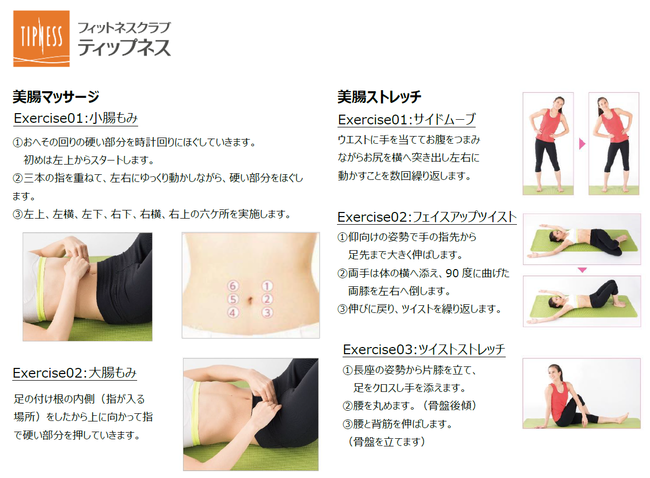 フィットネスクラブを運営する株式会社ティップネス(東京都港区)により開発された、腸能力アップのための腸エクササイズです。腸に刺激を与え、腸のリズムと柔らかさを整える美腸マッサージをはじめとする特別メニューで腸の活性化を促します。