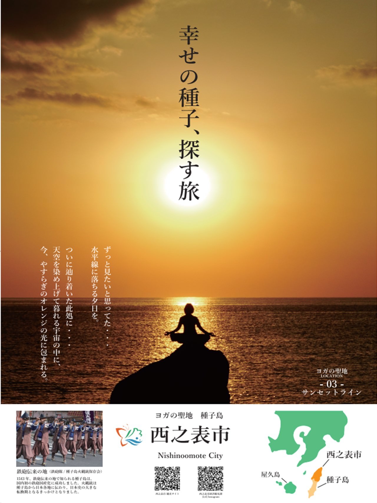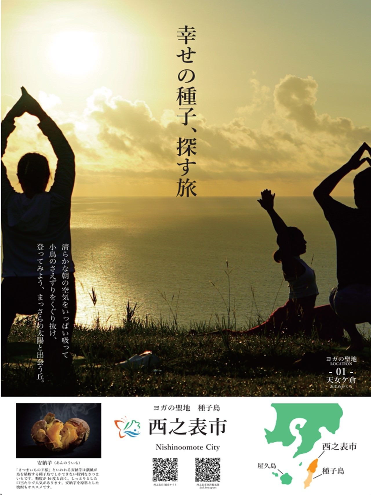 本年度、西之表市では、この全国自治体初の「ヨガの聖地認定」をフックとし、西之表市独自の文化・風習、歴史、自然、食、温泉などの観光資源を、新しい生活様式に沿った対策と、「健康」「癒し」「豊かさ」等のウェルネスツーリズムの観点で再整理・磨き上げをおこない、観光地として安心して楽しめる環境となるように整え発信し誘客を図ることを目的とし取り組みをおこないました。