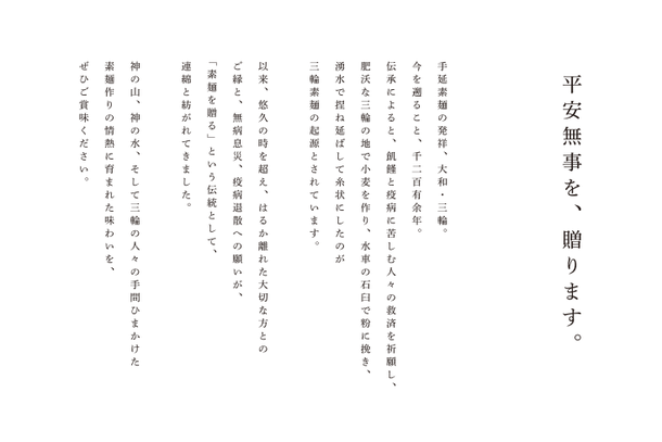 三輪そうめんはかつて、疫病退散への祈りから誕生しました。奈良県三輪素麺振興会は全世界で新型の疫病が猛威をふるう中、疫病退散の願いをそうめんに込めて皆様にお届けしたいと思い、大神神社の祈祷御札入り商品を販売いたします。