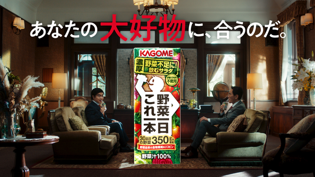 昨年に続いて出演いただく松重豊さんに加え、今回新たに加藤諒さんを迎えました。昼下がり、豪華で物々しい雰囲気の執務室の中で、「野菜一日これ一本」を片手に大好物のメニューを夢中でパクパク食べる二人。2人のユーモラスなやりとりを通じて、「野菜一日これ一本」の濃厚なトマトのうま味が、どの食事にも合うことを表現しています。