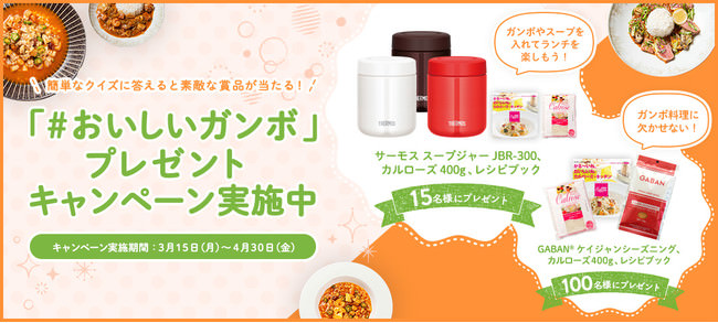 公式ウェブサイトに開設した「#おいしいガンボ」のページから簡単なクイズにお答えいただいた方を対象に、抽選で15名様に「サーモス スープジャーJBR-300」、100名様に「ガンボ」作りに欠かせない「GABAN® ケイジャンシーズニング」の各商品に、カルローズのサンプル米(400ℊ)&オリジナルレシピブック「カルローズ・キッチン」をセットにしてお送りします。