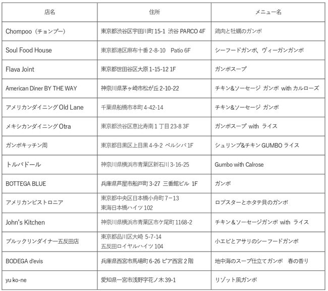 ●カルローズ使用のガンボを提供しているレストラン【テイクアウト含む】