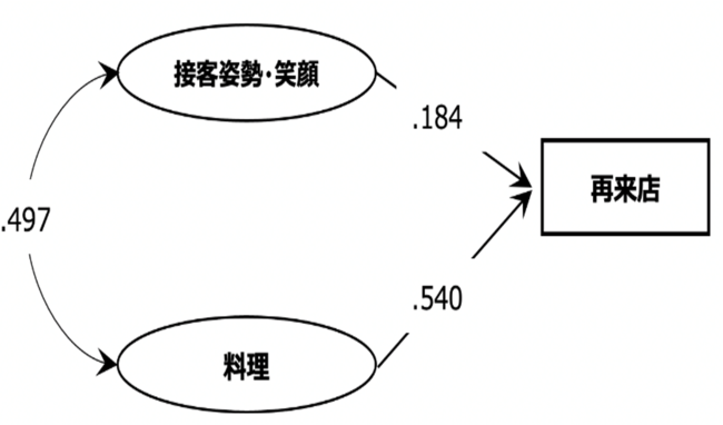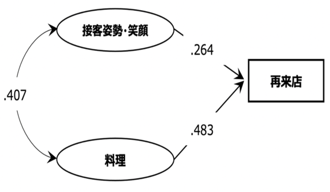 つまりこれまで「料理」と「接客姿勢・笑顔」は一体となって評価されていたものがその関係が少し変化し、「料理」と「接客姿勢・笑顔」がそれぞれ独立して「再来店意向」に寄与していることとなります。
