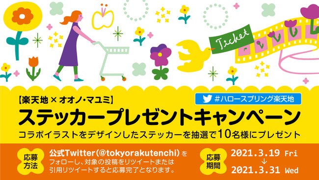 株式会社 東京楽天地(所在地:東京都墨田区江東橋4-27-14 、取締役社長:浦井敏之)が運営する、楽天地ビル(所在地:東京都墨田区江東橋4-27-24)は、3月19日(金)より墨田区生まれのイラストレーターであるオオノ・マユミ氏とコラボし、本イベントの為に描き下ろされたオリジナルのイラストを館内に装飾するイベント「Hello Spring! -RAKUTENCHI-」を開催いたします。また期間中には、同じく墨田区に店舗を構える一軒家カフェ「ikkA」とコラボした、オオノ氏のイラストがパッケージにデザインされたお茶のセットなどが当たるSNSキャンペーンも実施予定です。