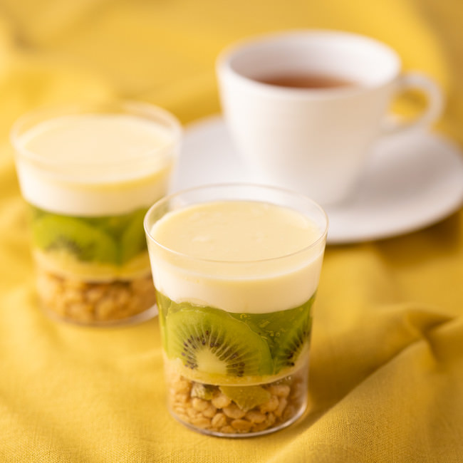 キウイ、レモンとヨーグルトのそれぞれが持つ特徴的な酸味を、濃厚なホワイトチョコレートのソースを合わせることで、マイルドな口当たりに仕上がりました。上から順に、ホワイトチョコレートのソース、ヨーグルトのブランマンジェ、コアントローとキウイのマリネ、スポンジケーキ(生地)、レモンのマーマレード、ホワイトチョコレート、グラノーラと7層仕立て。通年手に入るキウイですが、実は春が旬。グラノーラにドライキウイをミックスしてさらに“春感”を加えました。フレッシュな春の味覚を贅沢に味わえる一品です。