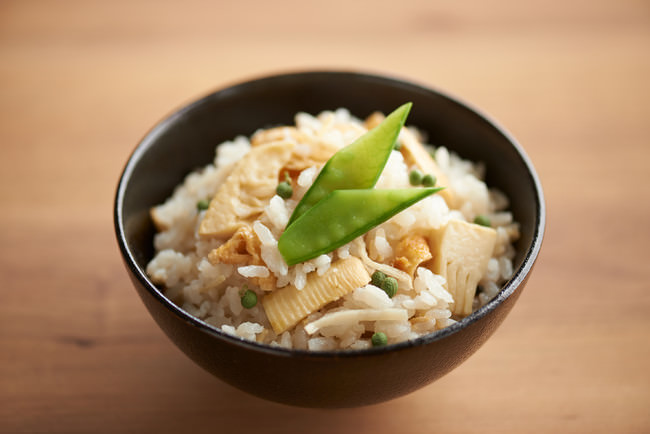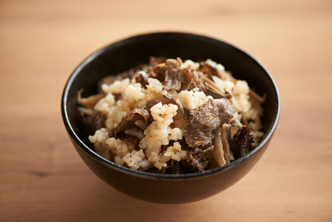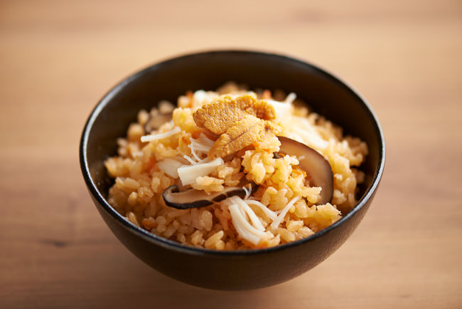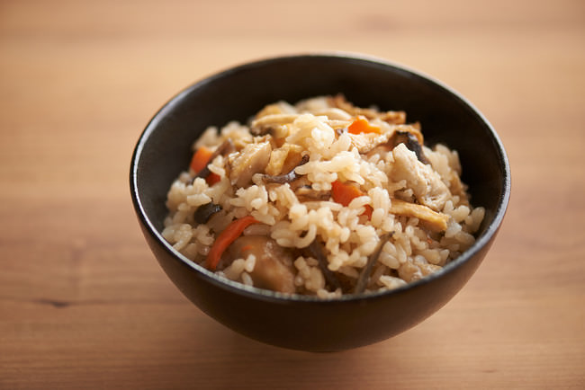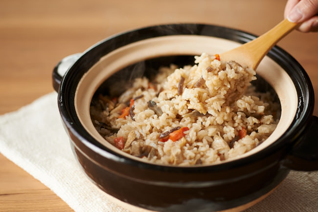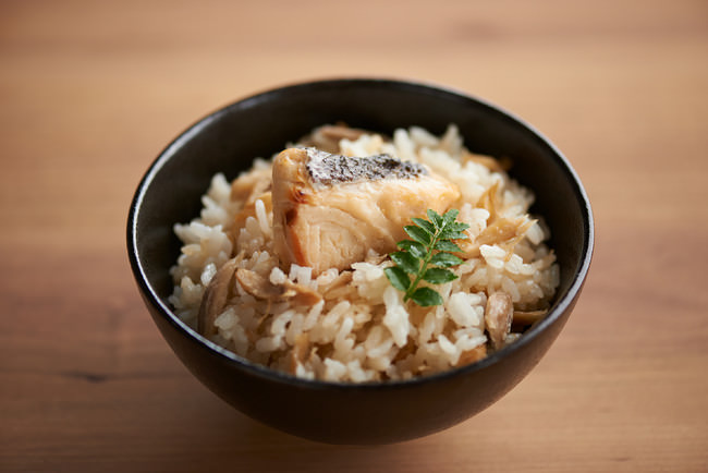 自宅で手軽にできてしまうからこそ、手間ひまの違いがわかるのが“かやくごはん”。こだわりは、6種類の素材、かつお・さば・あご・うるめ・めじか・羅臼昆布を合わせた白だしに、旬の食材をはじめ、具材をたっぷり盛り込み炊き上げています。