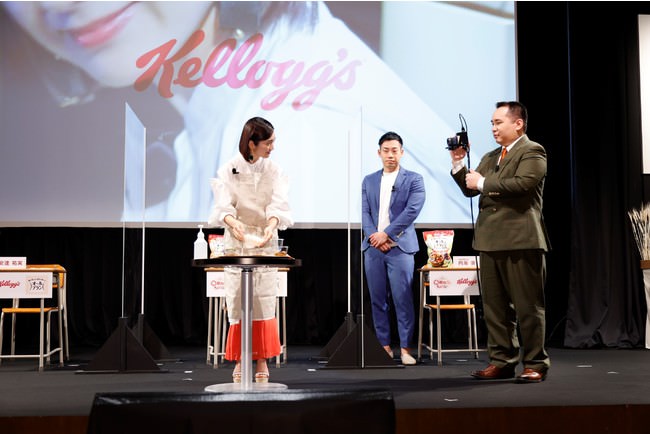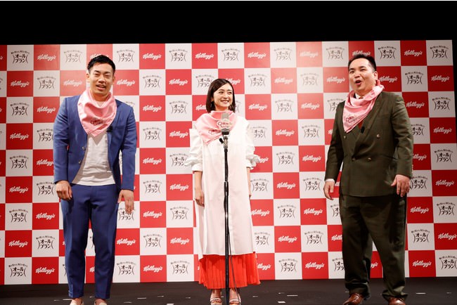 それに際し、同日、赤坂インターシティコンファレンスにてPR発表会を開催いたしました。発表会には、「ケロッグ オールブラン」ブランドアンバサダーである安達祐実さんと、ケロッグ公式応援サポーターのミルクボーイさんがゲストとして登場。國澤純先生を講師に迎えた特別セッション「腸能力アップチャレンジャー認定講座」では、安達祐実さん、ミルクボーイさんが受講生として「腸能力」について猛勉強。腸能力アップの秘訣を学んだ3人は、その後の試験を経て、晴れて第一号チャレンジャーに認定され、その決意を語りました。またイベントの最後には、ミルクボーイさんによる新ネタ「おかんの腸能力」もサプライズ披露されました。