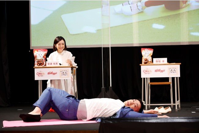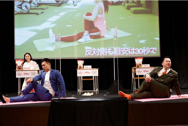 続いて、ミルクボーイ さんが「美腸エクササイズ」にチャレンジ。エクササイズを監修したティップネスのフィットネストレーナーである宮崎紗衣さんによるビデオ講義に倣い、二人も「フェイスアップツイスト」と「ツイストストレッチ」を壇上にて実践。最初は難しいエクササイズは苦手!とコメントしていた二人も、数分のエクササイズを経て「何だか、腸の調子が良くなった気がする。。。」(駒場)、「私でも毎日実践できそうですね」(内海)などとコメント。10日間チャレンジへの自信を深めていました。