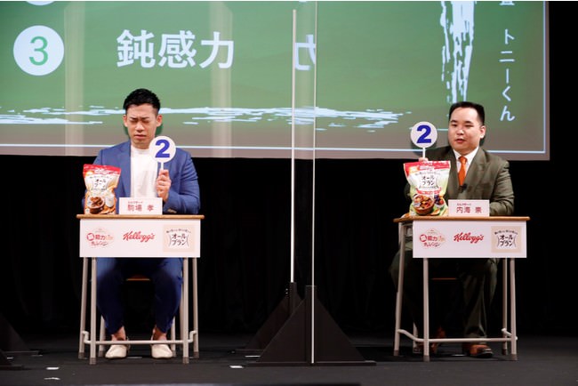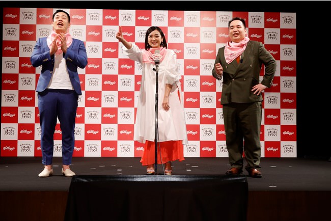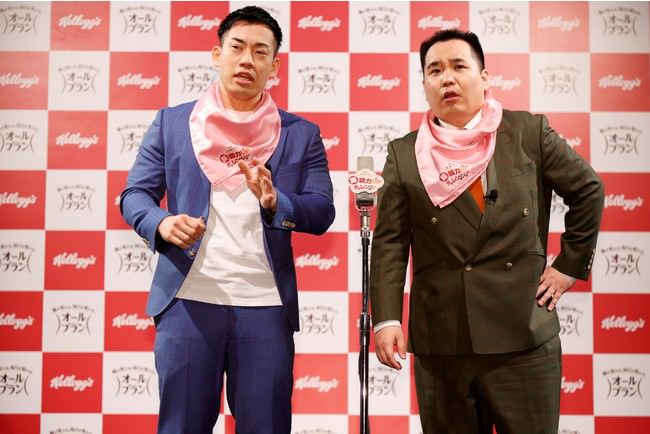 3人にとって、おそらく人生初となる“腸活学”への取り組みを経て、「腸活チャレンジャーズ」となった3人は、今後の「腸能力アップチャレンジ」に向けて「オールブランを食べ続けて実感として体のサイクルが整っている感じがするので、これを広めいきたいです。」(安達祐実さん)、「食事と運動を教えていただいたので、毎日続けていきたいです。」(内海さん )などの抱負を熱く語りました。そんな中、駒場さんが「とても勉強になりました。腸能力にはまっている、うちのおかんにも教えてあげたいことばかりですね」とあの“おかん”について触れたことから、2人の漫才モードが突如、スイッチ・オン。「あー、そういえばな、今朝家出るときに、おかんが腸能力アップに欠かせないものが何かおもいだせへんっていっててんな。」といういつものフリから、学びたてホヤホヤの腸活知識満載の新ネタ「おかんの腸能力」がサプライズ披露されました。