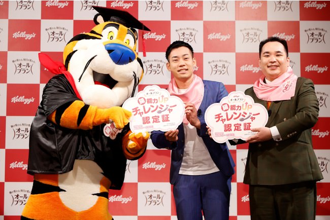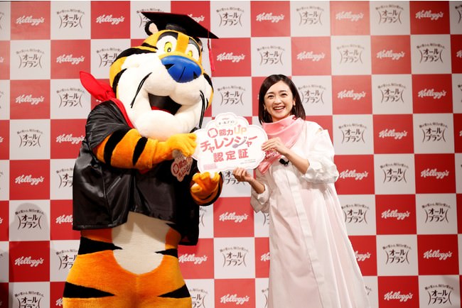 レシピとエクササイズについて学んだ3人は、最後に「腸能力アップチャレンジャー認定試験」にチャレンジ。全3問の問題を見事クリアした3人は、晴れて「腸能力アップチャレンジ 第一号チャレンジャー」に認定されました。直後に行われた認定式では、ケロッグの公式マスコットキャラクターであるトニー・ザ・タイガーが、卒業式の衣装を着こなし、プレゼンテーターとしてサプライズ登場。認定証とともに、第一号チャレンジャーの証となる認定スカーフを3人に授与しました。