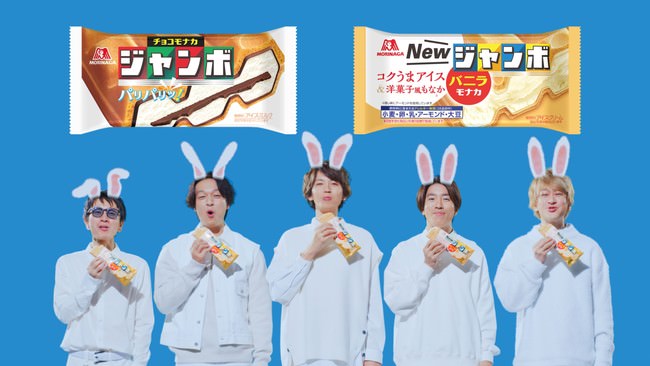 『チョコミミ』篇では全身白の衣装を着た関ジャニ∞メンバーが、今回新たに“チョコミミ”が付いたバニラモナカジャンボを、チョコではなくウサギのミミを頭に付けて紹介します。ウサギのミミも気になりますが、チョコのミミでバニラモナカジャンボが今までとどう変わったのかも気になる内容となっています。また、CM楽曲は先日発売された関ジャニ∞の新曲「Sweet&Bitter」。実はこれ、バニラモナカジャンボとのタイアップ曲となっており、歌詞に「バニラ」と入っていたことにピンと来た方もおられるのではないでしょうか。