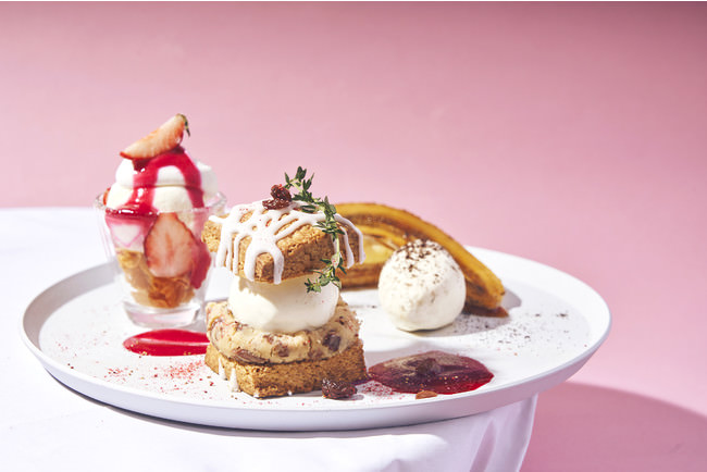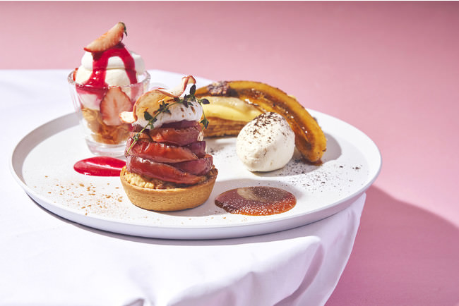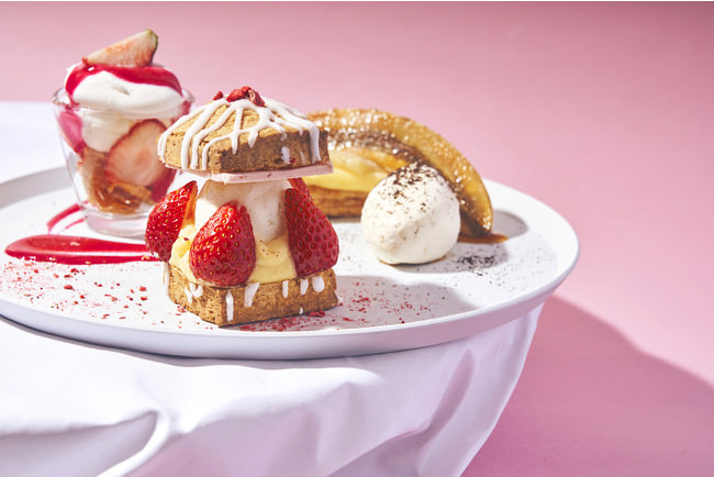 焼きバナナのカスタードチョコパイにデザートプレート限定のショートケーキパフェがセットになった、メインが選べる贅沢なプレートです。