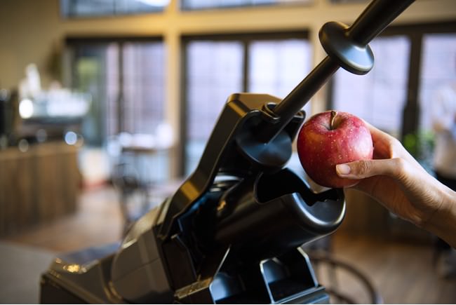 野菜や果物からナッツのような硬い原料などを切らずにマシンへ投入できます。製品特長である素材の粗削りとプレス(圧力)は同時ではなく、2段階で行います。そのため搾汁時に熱の発生を最小限に留め、素材本来の栄養素を残して強い圧力でゆっくり搾汁できます。また、皮や繊維物が分離され、サラサラした喉越しのよい ジュースが味わえます。小型化によって、バイオーダーにも対応が可能となります。