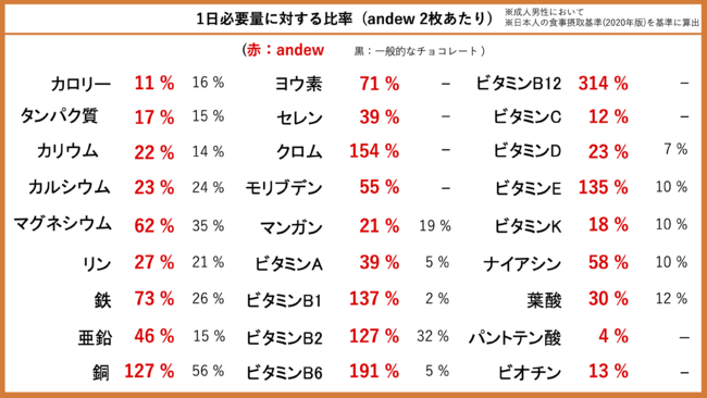 下表は、板チョコのandew ( 1枚50g )2枚に含有している各栄養素の成人男性の1日の基準量に対する割合を示したものです。