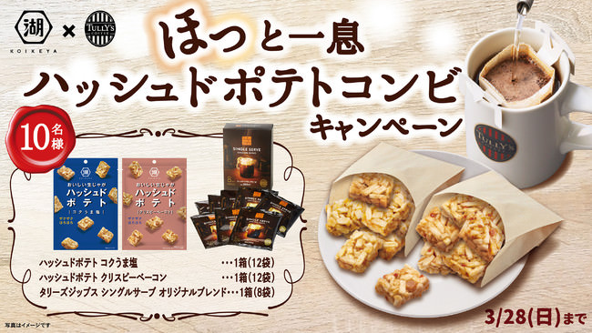 まるで料理のような本格感とスナックの手軽さを兼ね備えた「ハッシュドポテト」はコーヒーと一緒にお召し上がりいただくことで、ちょっとした軽食としてもお召し上がりいただけます。ぜひ、「ハッシュドポテトコンビ」でホッと一息ついていただきたいとの思いから、当商品と本格的コーヒーの味わいが簡単に楽しめる「タリーズジップス シングルサーブ オリジナルブレンド」をセットにして抽選で10名様にプレゼントするキャンペーンを実施します。