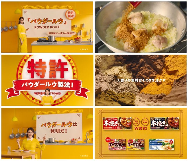 キッチンに立つ吉田さんがパウダールウを「この半世紀に一度の大発明」と講義風に紹介。「さーっと溶けやすく脂も少なく食材活きる」「コクの素材はじっくり加熱」「香りの素材はそのまま活かす」などその特徴・魅力をわかりやすくテンポ良く伝えます。