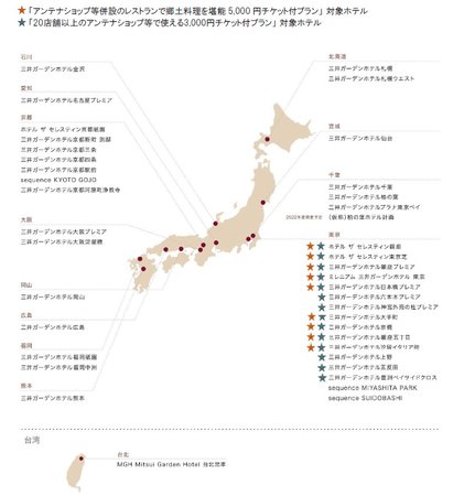 株式会社三井不動産ホテルマネジメント(本社:東京都中央区)は、2021年3月22日(月)より、「ザ セレスティンホテルズ」と「三井ガーデンホテルズ」の都内計14施設において、全国14都道府県の魅力を発信する、都内10店舗以上のアンテナショップ等併設のレストランでご利用いただけるチケット付宿泊プラン、ならびに、20店舗以上のアンテナショップ等でご利用いただけるチケット付宿泊プラン、2種類のプランを販売開始いたします。