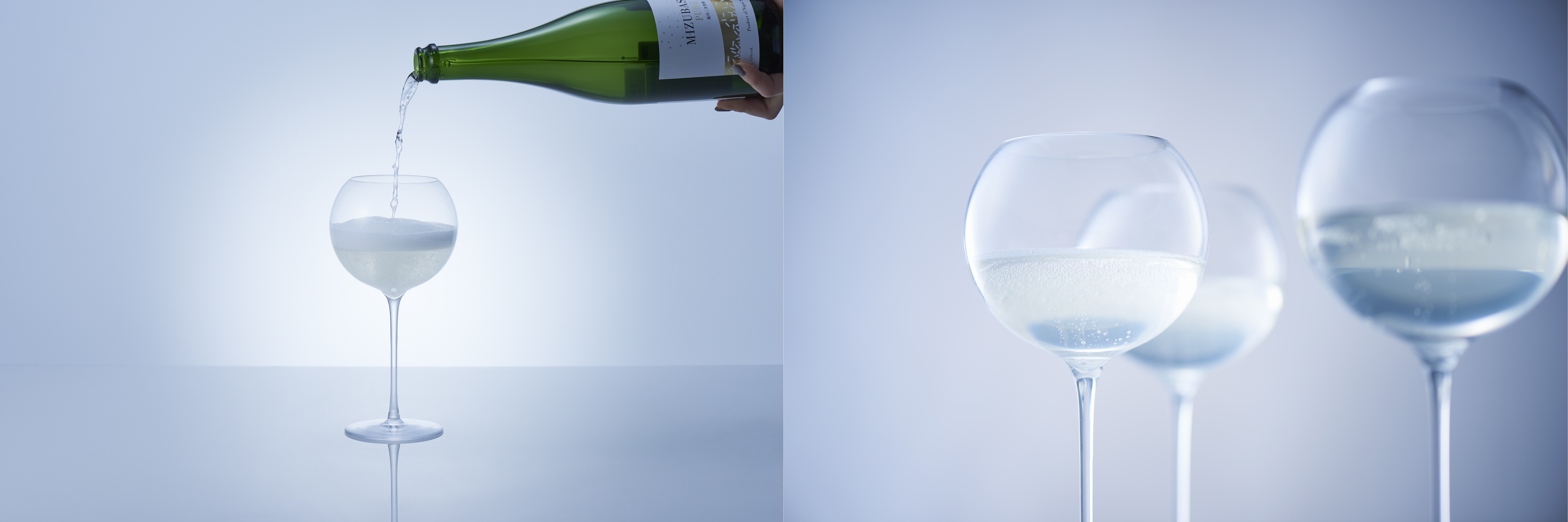 「IMMERSION」は“没入”の意味。丸いグラスの底にはVラインが形作られており、awa酒を注ぐとグラス内に均衡の取れた渦を形成し、垂直に下降する“没入”が可能になり、美しく泡が立ちます。グラスのリム部分は軽く閉じられることで、グラスの中に香りがたっぷりと広がり、また唇にあたる部分は薄く仕上がっているため、繊細な味わいを楽しめます。