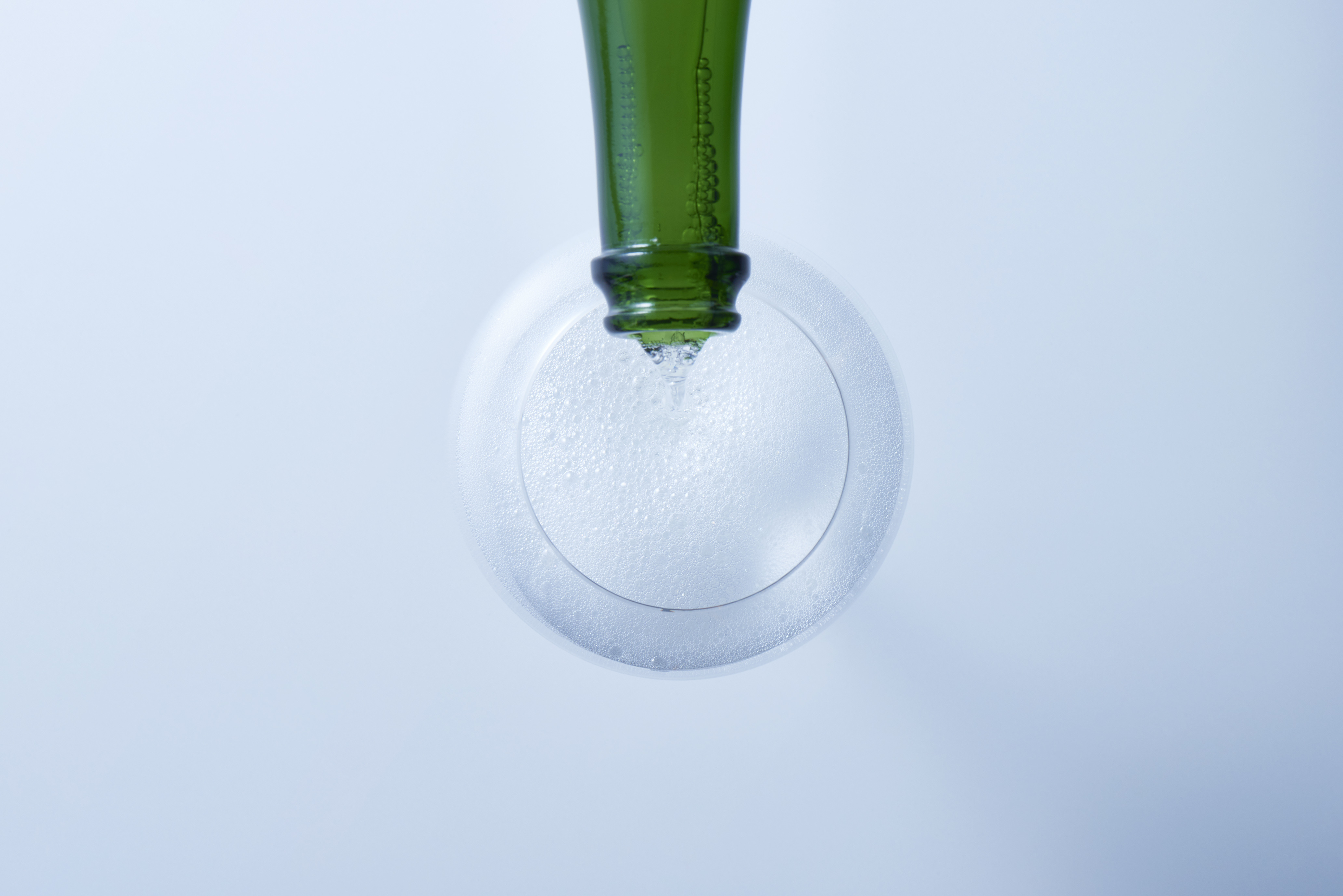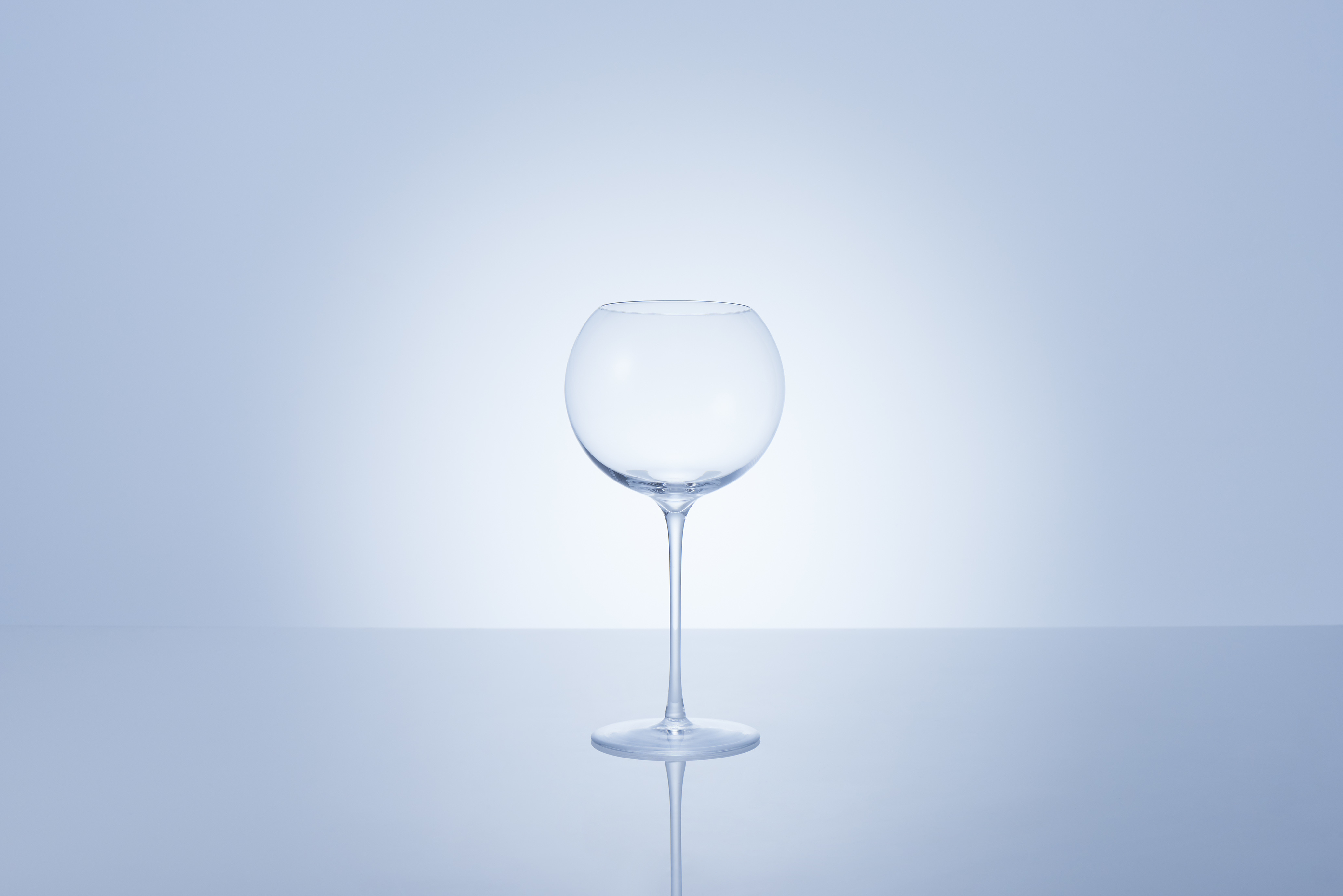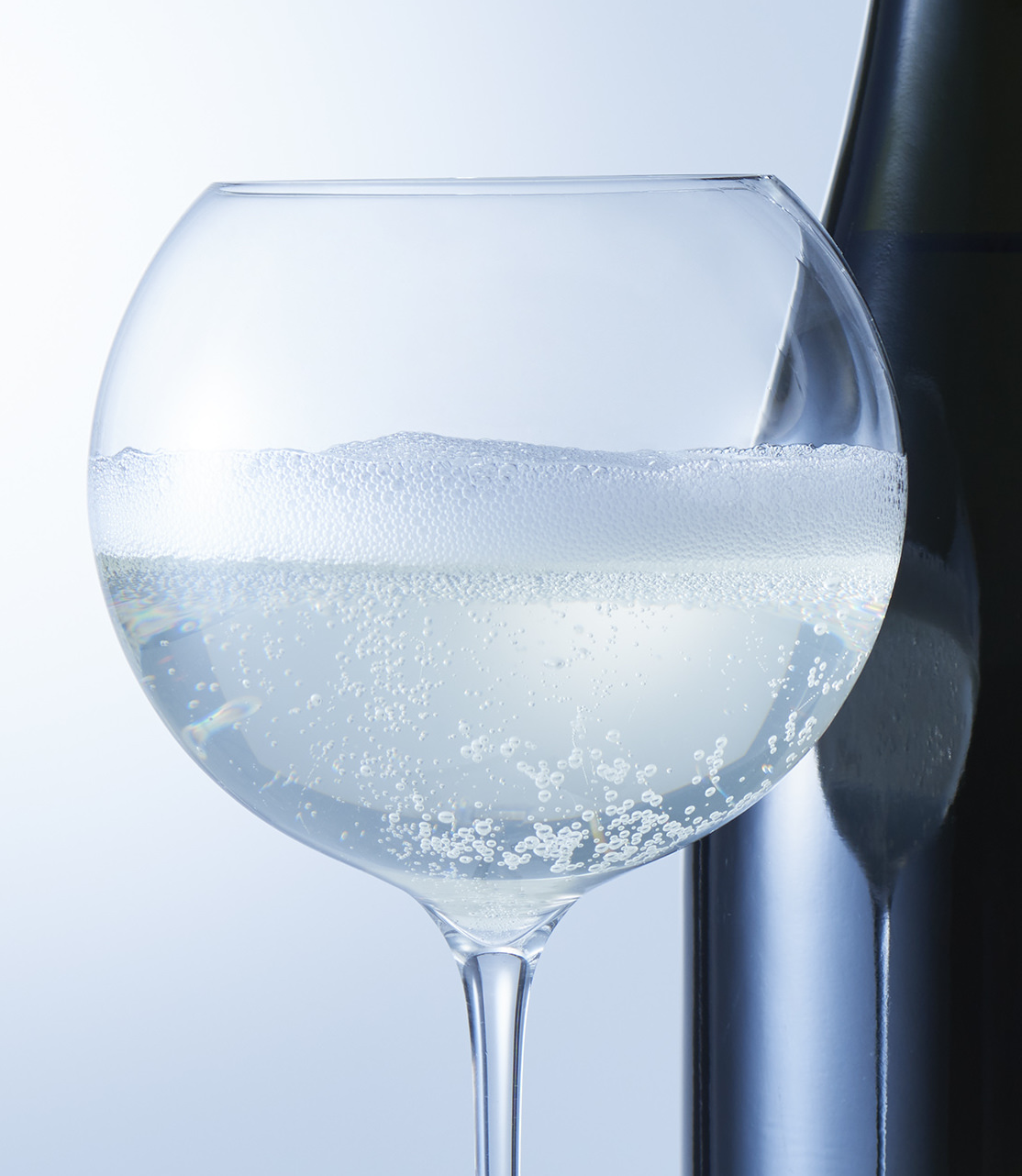 テーブルにこのグラスがサーブされると、たちまちその独特の世界観がオーラを発揮。存在感が抜群で遠くからでも目立ち、一度見たら記憶に残るシルエット。細いステムは手によくなじみ、とてもエレガント。風鈴にも似た丸いグラスの中では、泡がのびやかに自由に弾け、絶妙な風味の広がりを堪能できます。グラスを斜めに傾けながらスタイリッシュにサーブするのがおすすめ。