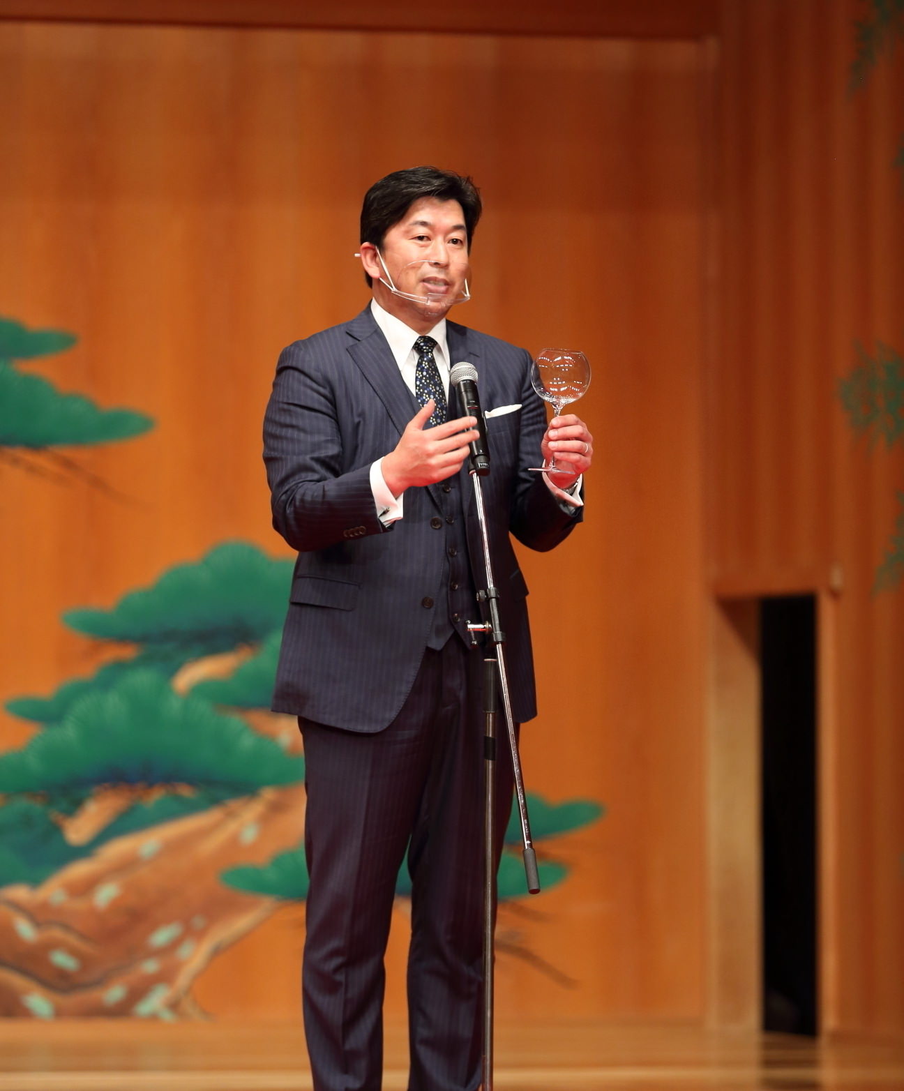 ▲3月9日のメディア発表会で協会オリジナルグラスをお披露目する永井則吉代表理事