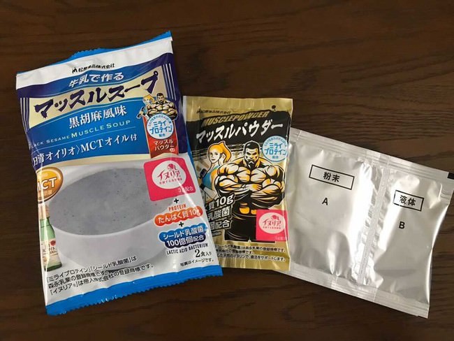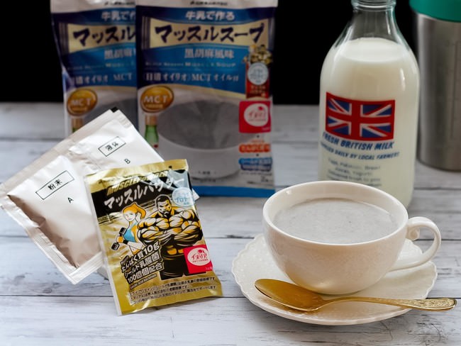 ■使用方法:粉末スープおよびマッスルパウダーを200~220mlの牛乳または水で溶かし、MCTオイルをかけてお召し上がりください。(シェーカー使用推奨)