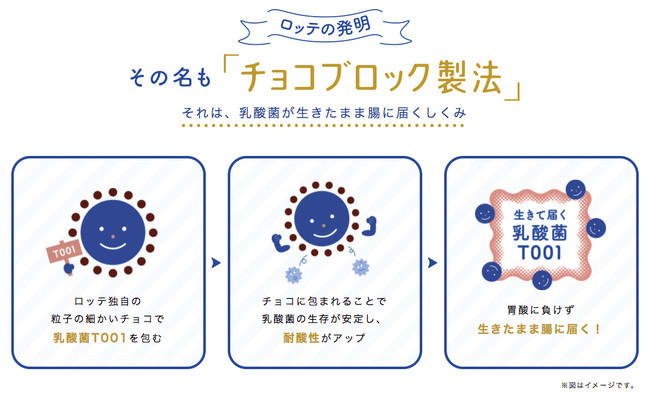 - 乳酸菌ショコラは、ロッテ独自の「チョコブロック製法」で乳酸菌T001を生きたまま腸に届けるチョコレートです。チョコレートで大切に包まれた乳酸菌T001は、チョコレートの中で安定的に生存し、胃酸にも負けず腸までとどきます。