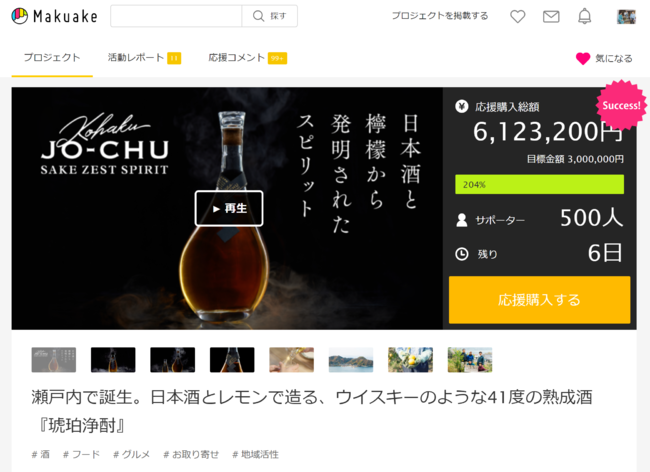 広島県の日本酒酒蔵再生スタートアップであるナオライ株式会社(本社:三角島、代表取締役:三宅紘一郎、以下:ナオライ)は、日本酒と有機レモンから生まれた新商品『琥珀浄酎(こはくじょうちゅう)』の先行販売クラウドファンディングを2021年2月12日(金)より開始し、公開から6週間で支援者数500名・目標金額の200%を突破しました。3月28日(日)開催予定のオーガニックレモンの植樹イベント@三角島をはじめ、クラウドファンディング終了に向けたカウントダウン企画を複数回予定しています。
