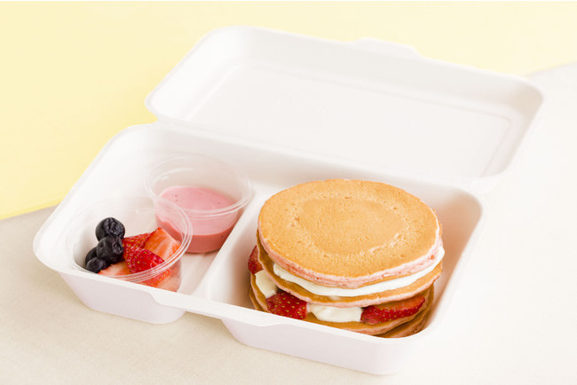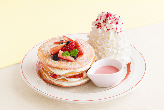 苺とミルククリームをミルフィーユのように重ねたパンケーキ。ベリーの甘酸っぱさとミルクの優しい