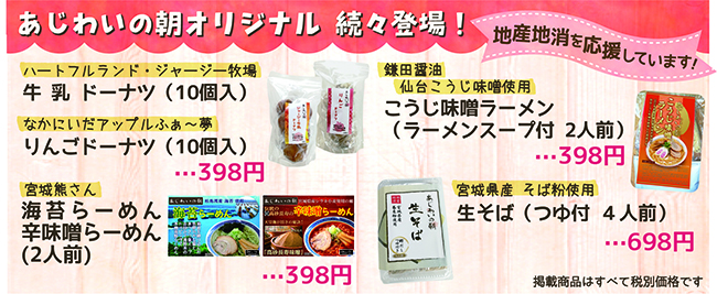 あじわいの朝では「地産地消」をキーワードに、オリジナル商品の開発にも力を入れて取り組んでいます。宮城県産の食材を使用したここでしか買えない商品はお土産にもぴったりです。